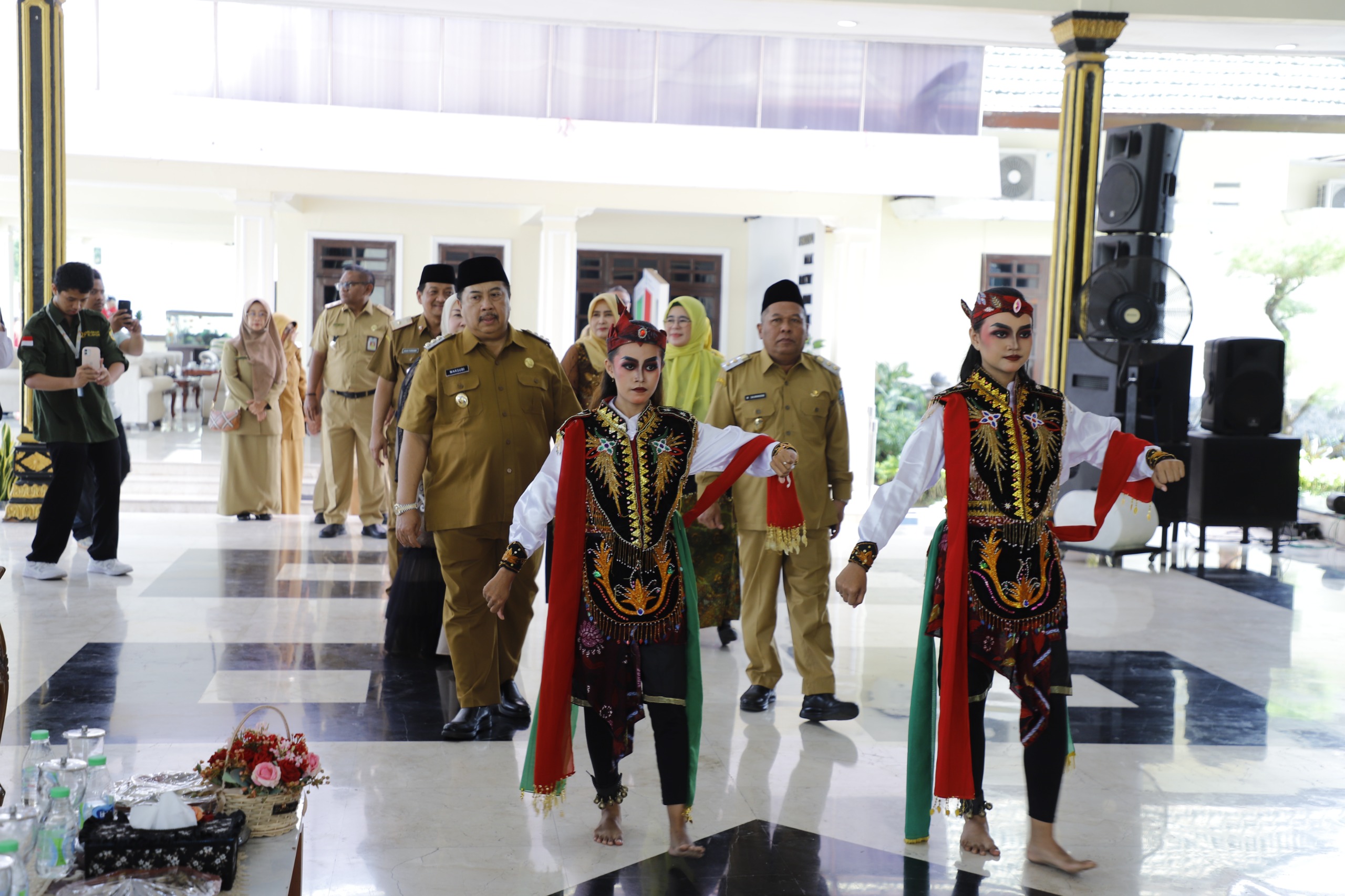 Tiba dilokasi acara, Bupati Jombang Warsubi yang hadir bersama Ketua Tim Penggerak PKK Kabupaten Jombang Yuliati Nugrahani Warsubi yang juga Bunda GenRe, Wakil Bupati Jombang Salmanudin beserta Ning Ema Erfina, Sekdakab Jombang Agus Purnomo beserta Ketua DWP Kabupaten Jombang Lilik Agus Purnomo dan para Kepala OPD terkait disambut oleh cucuk lampah penari remo.